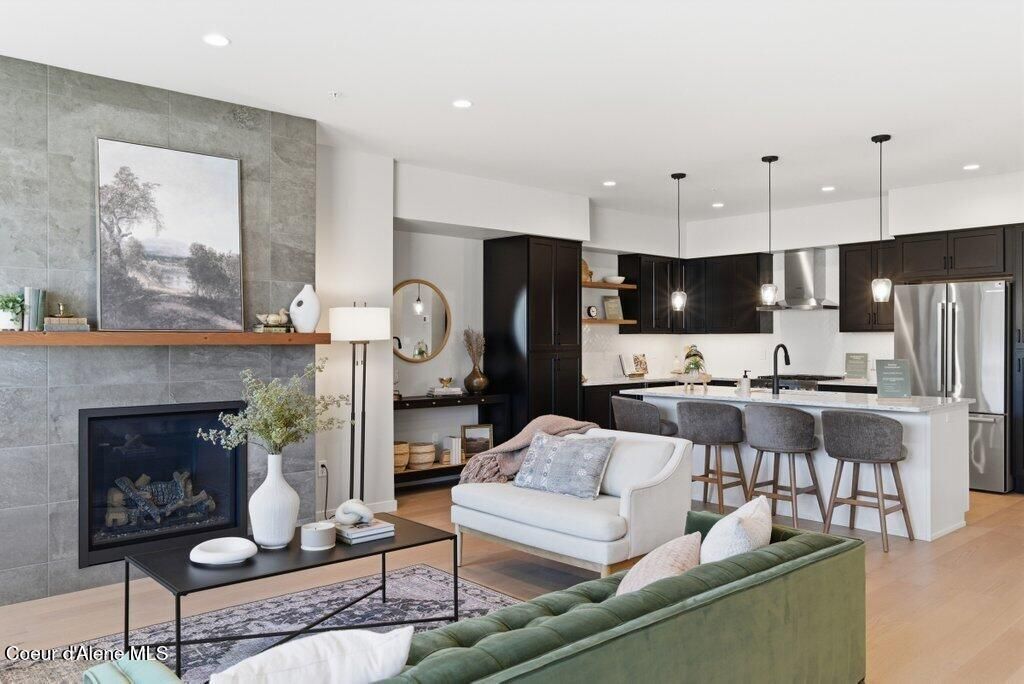 $15,000 limited builder incentive offered. This phase is now eligible for conventional financing with as little as 5 percent down for qualified buyers!Enjoy a low-maintenance lifestyle in one of Post Falls' most walkable mixed-use communities--just minutes from the Centennial Trail, Spokane River, marinas, and access to Lake Coeur d'Alene, along with nearby shops, restaurants, and everyday amenities.Designed with a clean, modern aesthetic, the home features hardwood flooring, a floor-to-ceiling tiled gas fireplace, quartz surfaces throughout, expansive windows, ample storage, and a spacious kitchen with high end appliances. The upstairs features 2 en-suite bedrooms in a split layout, a family room, and a laundry room. The primary suite features wood and tile floors, a dual-sink vanity, and a mud-set tile shower. A heated, oversized detached garage with epoxy floors opens to a private fenced courtyard, thoughtfully designed with concrete, turf, and landscape rock--offering a functional, low-maintenance outdoor space.Above the garage, a fully finished 655 sq ft bonus area provides flexible use for a home office, gym, media room, or guest space, complete with heating and cooling. Plumbing is already in place, allowing for future expansion with a bathroom and/or kitchenette if desired.Although this unit has a townhome style layout, it is a condo. The association dues cover landscaping, snow removal, common element insurance and maintenance, including structural elements and building exteriors, for a truly low maintenance lifestyle.